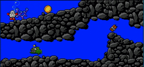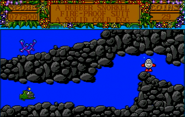 Furthermore, the three item limit is a huge pain, as a result of the game frequently requiring you to have other items in your inventory in order to not die. About a third into the game you get access to the snorkel, and from that point on you need to keep that snorkel in your inventory for the majority of the game, as much of the remaining gameplay consists primarily of carrying items on opposite sides of the map back and forth across the ocean, and Dizzy will die instantly in water without the snorkel. Also, don’t drop the snorkel underwater. If the item you need to use is below the snorkel in your inventory, you’re going to have to go back to dry land to reorder your inventory again. So now you only have two inventory slots to work with which results in even more backtracking. There's also a fire-proof suit that also takes up an inventory slot, and you're required to use it in an area that you can only escape by swimming with the snorkel, so in that instance you instead only have one free inventory slot to work with.
