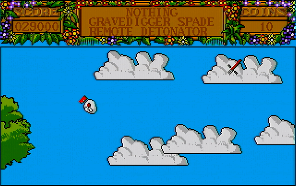 Now, although this salesman may be the most hateable character I've seen in a video game since Moneybags from the Spyro series, this setup isn't awful. As I said, the Dizzy games are very non-linear, and this objective of finding the treasures in any order you want suits the exploration focused gameplay. There is a genuinely satisfying sense of discovery from figuring out where to use every item and venturing into those hidden caverns that hold the treasures you're searching for. Dizzy is still finding its footing with this game, but the foundation is there for a unique take on the platforming genre. It's just, uh… everything else that lets the game down.
