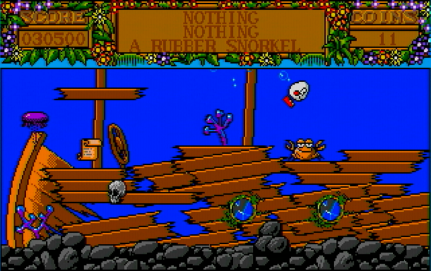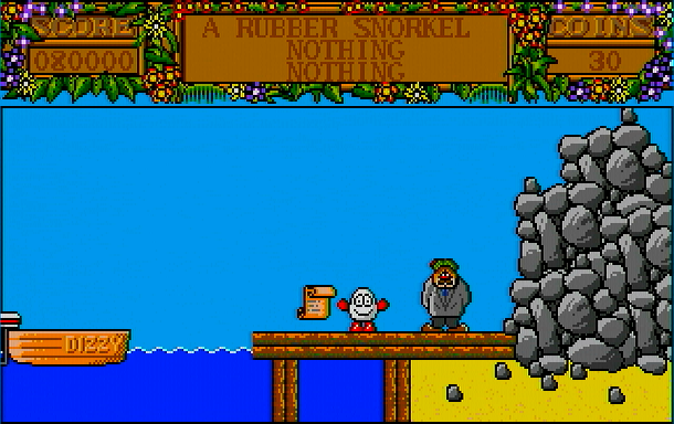 The Dizzy games can be classified as platformers, but they're actually quite a bit more unconventional than that label conveys. They're open, explorative and non linear games set in a single large interconnected world akin to a metroidvania, but unlike those games, Dizzy’s moveset is limited to moving left and right and jumping (with the additional caveat that he does mid-air somersaults when he jumps, and if he lands upside down he will then roll forward a bit further than where he landed in order to get back up on his feet) and he never gains any additional abilities that allow him to explore the game world further. Instead, progression in Dizzy is achieved via inventory management and puzzle solving akin to an adventure game. Dizzy can hold up to three items at once and you'll need to figure out the specific usage for each item. For instance, the first puzzle involves picking up an empty treasure chest and placing it next to a high ledge in order to use the chest as a stepladder. Other items provide passive effects as long as they're in your inventory, such as the snorkel allowing you to explore underwater without drowning. Owing to the Amiga’s one-button joystick standard, there's a single button used for both dropping and using an item, so if you attempt to use an item when there's nothing to use it on, Dizzy will drop it instead.