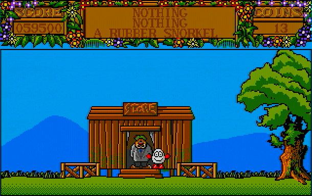 The game is just… annoying. The enemies are annoying because they're slow and it's boring waiting for them to move out of harm's way. The jumping mechanics are annoying since Dizzy rolling forward after landing a jump doesn't really add anything other than requiring you to land further back on the platform in order to avoid rolling off it. The inventory system is annoying because it requires reshuffling the order of items throughout the entire game while also restricting where you can reshuffle those items since you'll drown underwater if you drop the snorkel. The backtracking is annoying as the amount of back and forth you need to do in order to get items from one side of the island to another ends up tripling how long the game takes to beat with dull filler that consists of nothing but traversing the same screens you've already seen a million times. The one-hit kills and only having a single life are annoying because those game overs result in even more boring backtracking across the island now that you've lost all your progress. Heck, even the story is annoying due to Dizzy being frankly unsympathetic and the salesman being so utterly hateable.