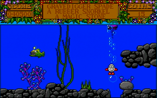 For a game where you are punished by losing absolutely all of your progress if you slip up once, the game also requires a fair amount of violations of common sense. Leaps of faith for instance are often required to get key items. Furthermore, in spite of the game training you to assume absolutely everything that moves wants to kill you, there's actually a few enemies that you need to jump into in order to beat the game. These purple flies drop coins when you jump into them, and in spite of one of the anglerfish killing you, there's another identical anglerfish that will instead swallow you whole, allowing you to retrieve a coin inside its stomach and then just leave back out through the mouth. So, Treasure Island Dizzy expects you to try jumping into every enemy in the game, in spite of the fact that nearly all of them result in an immediate game over.