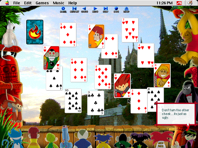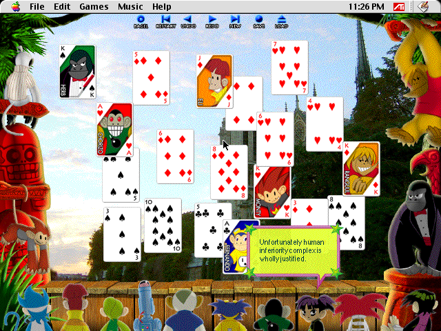 Burning Monkey Solitaire is a real game that in fact does include both burning monkeys and solitaire card games. One of the games included in the collection is 52 Card Put Down, where you put cards down on the game board, and every time you do so one of the monkeys watching you play the game calls you a dumbass idiot thot. They've got a lot of material to let you know about humankind’s inferiority to their monkey overlords. I'm getting deja vu. If that starts to get to you, you can instead play 52 Card Pick Up, where the monkeys instead throw sexually charged pickup lines at you every time you pick up a card. I could only find one video on Youtube covering 52 Card Put Down and the person playing it skipped all of the insults. Oh well.