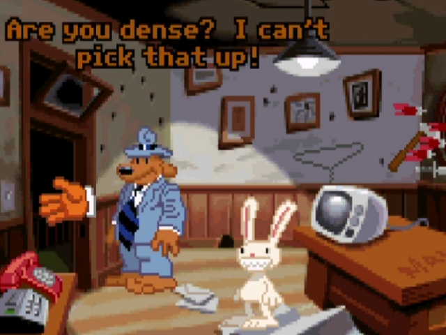 Trying to pick up an object that you are physically incapable of picking up in Sam & Max Hit The Road prompts Sam to say he can't pick that up. So far, so normal. If you keep trying to pick up that same object however, Sam will get more and more irritated with you, calling you dense, and then eventually turning to face the camera and say directly to you, punctuated for emphasis, that he Can't. Pick. That. Up. Keep at it long enough, and eventually he'll give up and start whimpering like a dog. Don't worry Sam, Max has got your back. As soon as he stops being amused by your pathetic whining.